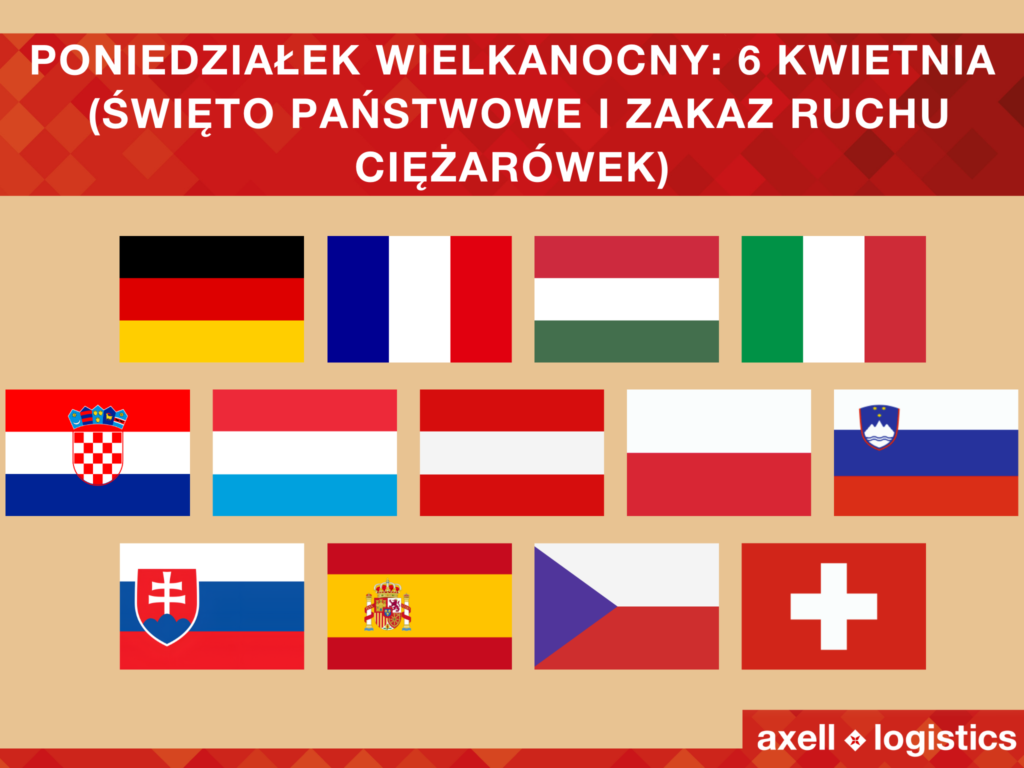 W wielu krajach Europy obowiązują zakazy ruchu dla pojazdów ciężarowych podczas świąt państwowych, takich jak Wielki Piątek, Niedziela Wielkanocna oraz Poniedziałek Wielkanocny. Przepisy te różnią się w zależności od kraju i mogą zależeć od dopuszczalnej masy pojazdu, lokalizacji oraz przedziału czasowego, co czyni je istotnym elementem planowania transportu międzynarodowego.